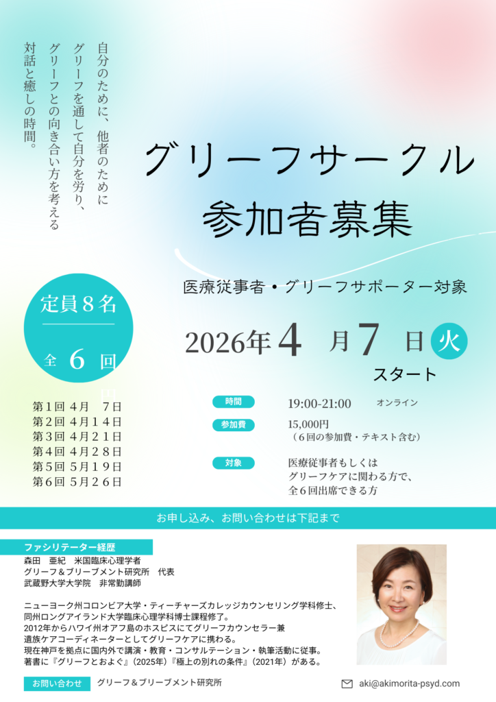一方、支える立場にある方も一人の人間として、グリーフを体験します。それは一時的なものかもしれませんし、ケアを提供する中で二次的に体験するものかもしれません。医療従事者・グリーフサポーター対象のグリーフサークルでは、自身の喪失を通して、グリーフへの理解を深めながら、付き合い方や、他者を支えるヒントを見つけていきます。今年第一弾は4月7日スタートです。