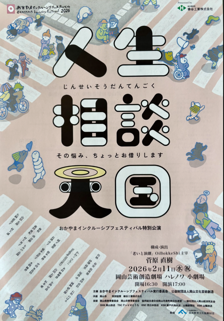 「老いと演劇」OiBokkeShi主宰の菅原直樹氏構成・演出の「人生相談天国」では人生の悩みを抱えた魂たちが仲間と対話を重ねながら即興でシーンを演じていきます。そう、正しい答えはありません。解決の糸口が見つかるかもしれないし、悩みが深まってしまうかもしれません。さあ、何が出てくるのか。私たちにもわからない新しい演劇の形です。2月11日(水・祝)16:30(開場)@岡山芸術創造劇場