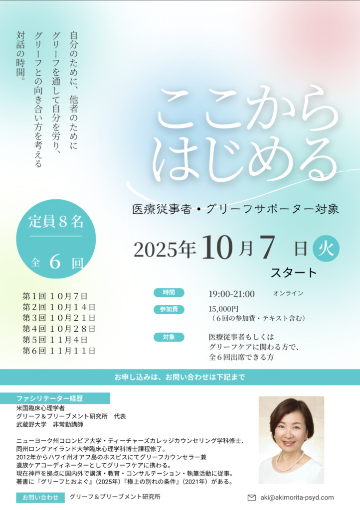 グリーフサークルは私がアメリカから帰国してから始めた活動の一つで、医療従事者・グリーフサポーター向けの学ぶ・語る・つながるグリーフケアの集いです。